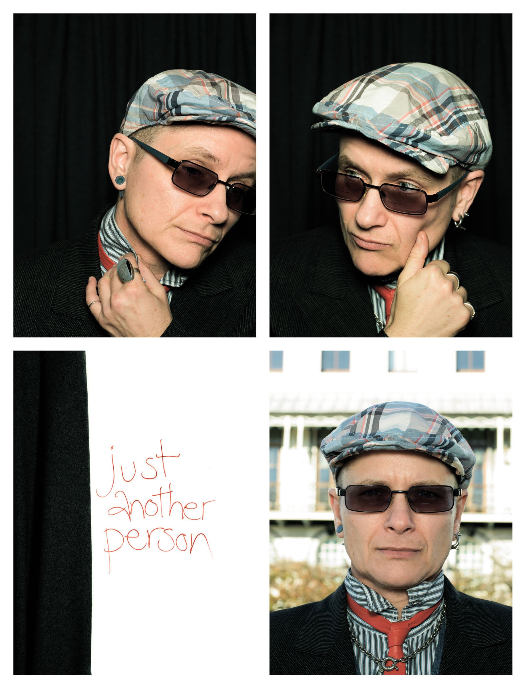 This portrait is of Luc Raesmith, and was created as part of Not Going Shopping in collaboration with Anthony and the 11 participants. It is composed of two self portraits taken in a photobooth, a written note by the subject of the portrait, and a portrait taken at Brighton Seafront (bottom right). Luc's written note reads: "just another person".