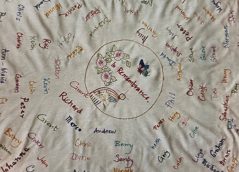 When I had pneumonia and I was bored in hospital someone suggested I do some needlework. I thought about it and decided to embroider a cloth with people’s name on it. That was about four years ago. Now there are 120 or 130 names on it, all people who’ve passed through Open Door at some time. I was classed as a professional funeral goer because I went to nearly all of them, but it’s my way of saying goodbye to friends. I did get to the stage where I thought I couldn’t cry anymore, but then you find that some are really hard. But some have been spiritually uplifting, because nowadays not everyone’s wearing black., quite often everyone wears bright colours. At one of them I went to, we all let off coloured balloons drifting off to heaven. Sometimes I get shaky when I go to funerals, like one last year. I went to someone’s funeral who was called Ken, and it kept going through my mind that it was like my own funeral. It was a strange experience. Sometimes I’m at a funeral and I think back to other people I’ve known…perhaps I hadn’t been able to let go at their funeral so I do at someone else’s. Most of them are younger than me, and often I feel guilty; why am I still going when they have gone? I’ve been told not to think that but I still do. There were three in one day once. It seems to go in cycles. That does get you down a bit.
