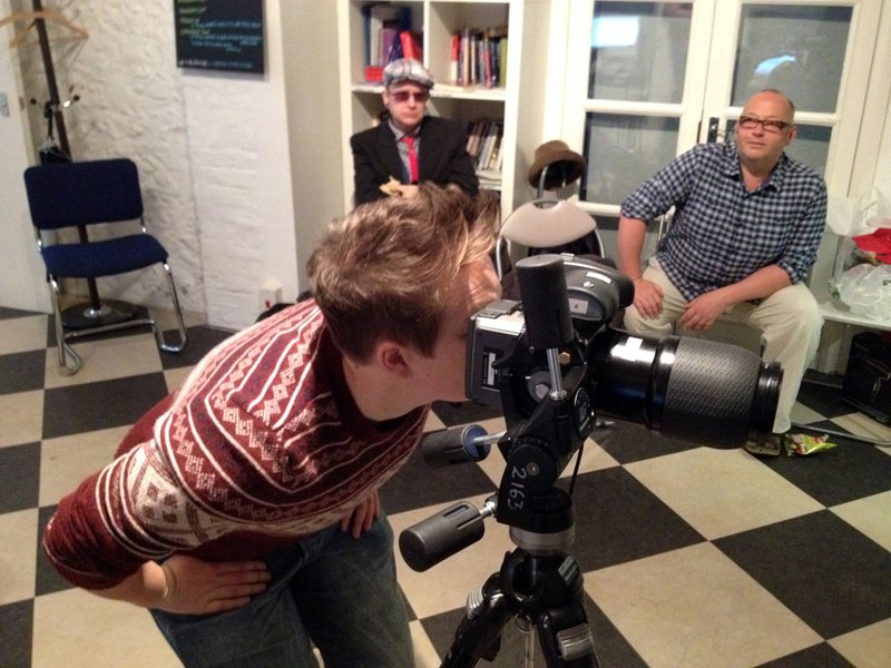 9. This photograph is taken from the perspective of the subject of a portrait session, capturing Edward Whelan behind the camera and Matt Robinson adjusting the lighting.