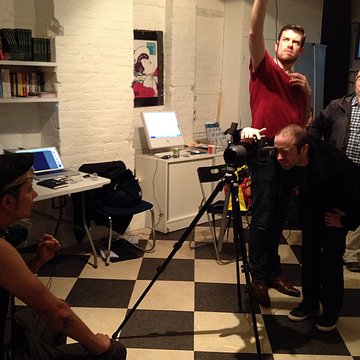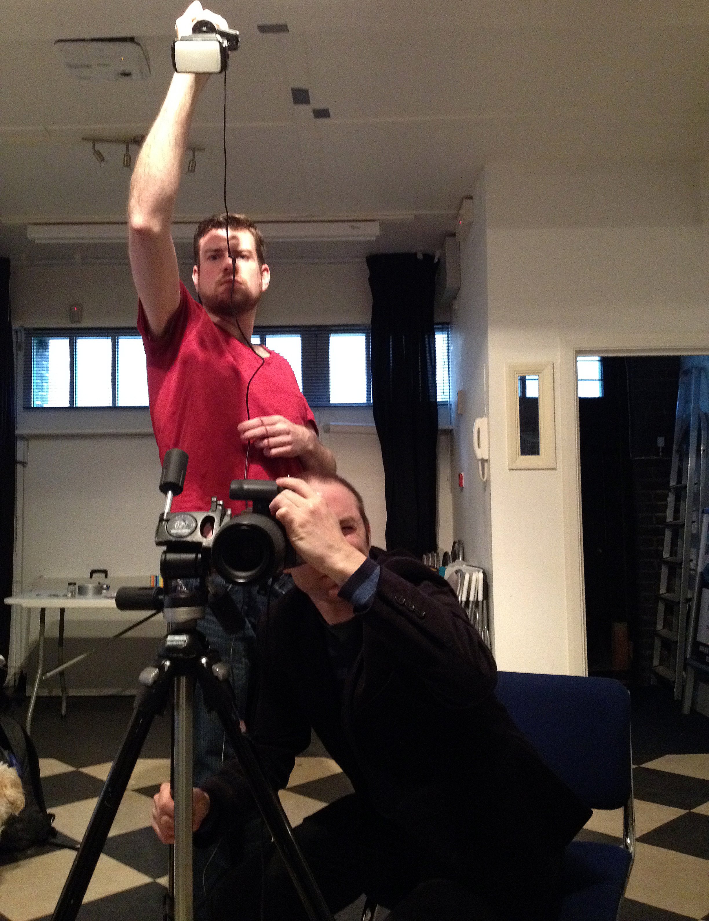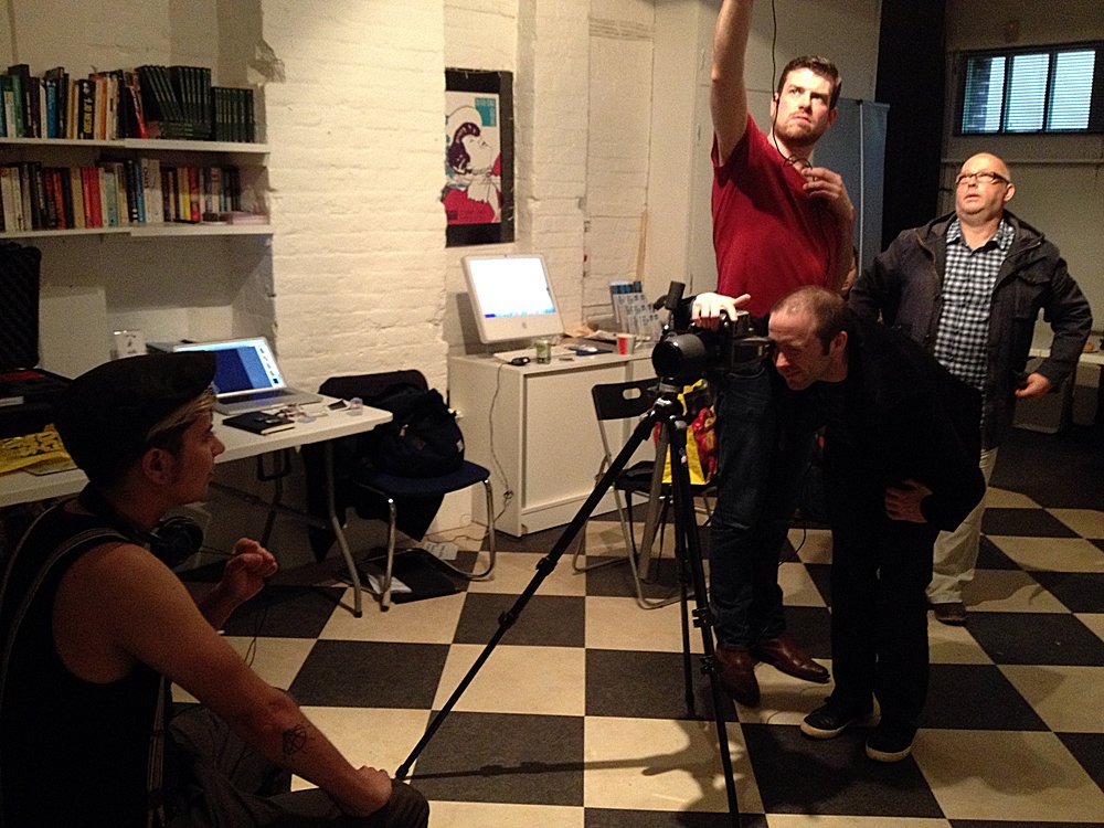 7. This image portrays Edward Whelan and Anthony Luvera behind the camera, with Luvera adjusting the lighting.