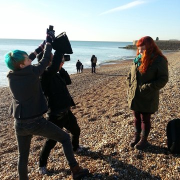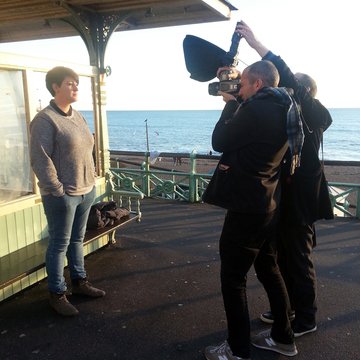 12. This image depicts Anthony Luvera and Kelly McBride taking a portrait of Sarah Magadalena Love on Brighton seafront.
