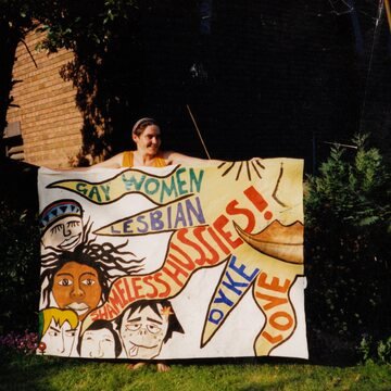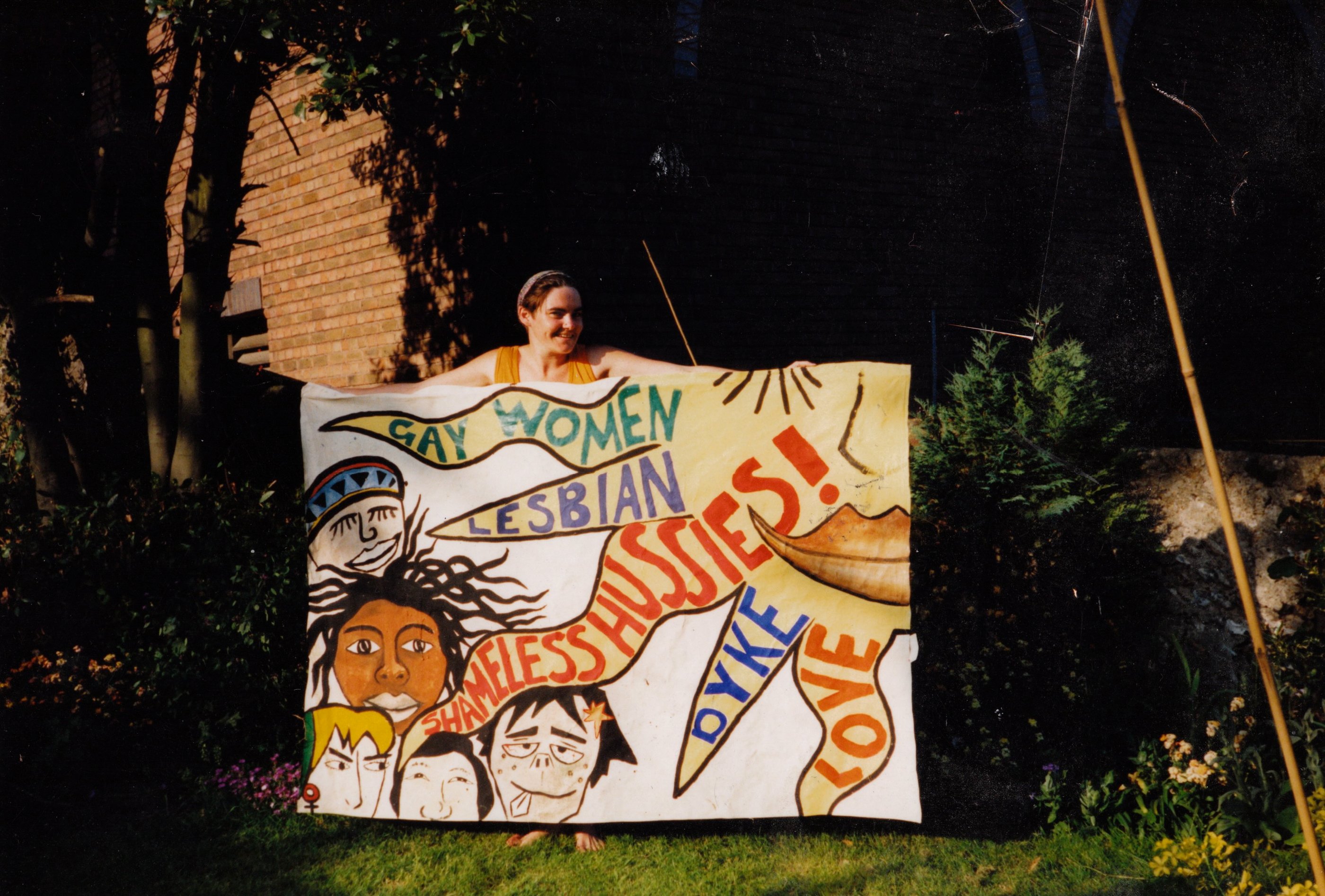 Quim Magazine had a stall, Lesbian Strength distributed Safer Sex Kits – easily reusable if washed in a gentle solution of bleach and hung on laundry lines. A slide show was provided by local photographer Abigail Dombey. Our first ever banner was created by Heiki Kathoka – an Aussie lesbian my ex Joss Munroe met in Bristol. Oh, the connections we all made. And against the odds it started to work.