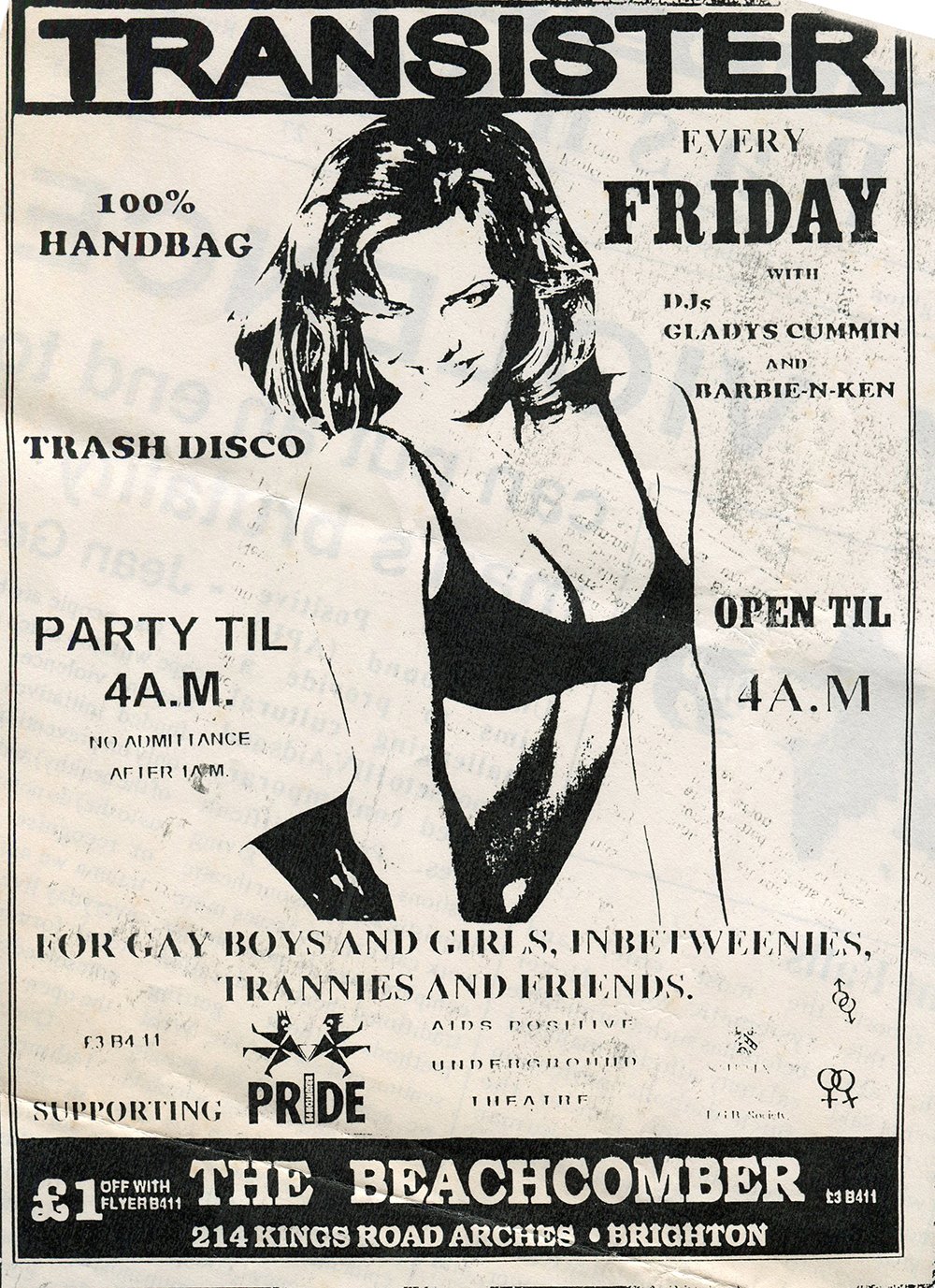 Advert for Transister, supporting Brighton Pride, The Beachcomber 18–27 May 1995. For gay boys & girls, trannies, inbetweenies and friends. This appeared on the back of the programme for Queer Bashed, a play by John Roman Baker, performed by the AIDS Positive Underground Theatre, at The Zap.