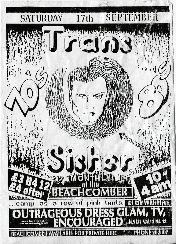 Flyer for monthly club night Transister at The Beachcomber 17 September 1994. £1 off entry with flyer. Outrageous dress glam, TV, encouraged.