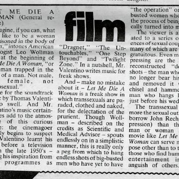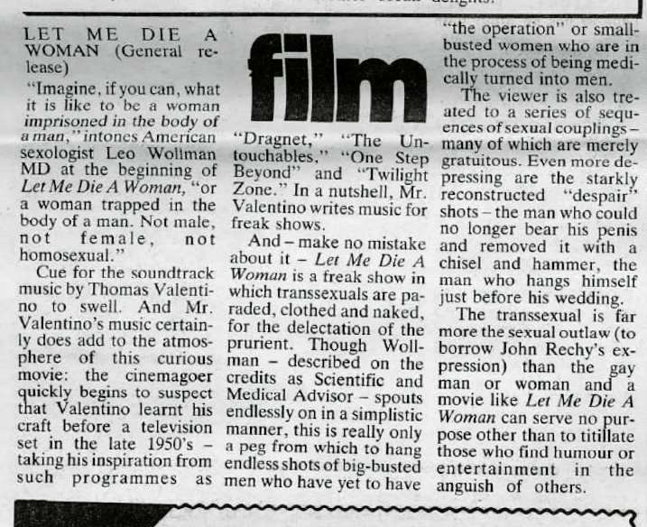 This is the concluding paragraph of the review: "The transsexual is far more the sexual outlaw (to borrow John Rechy's expression) than the gay man or woman and a movie like 'Let Me Die A Woman' can serve no purpose other than to titillate those who find humour or entertainment in the anguish of others." The advert for the film comes with the copy: Born a man... Let Me Die A Woman. All true! All real! See a man become a woman before your eyes!