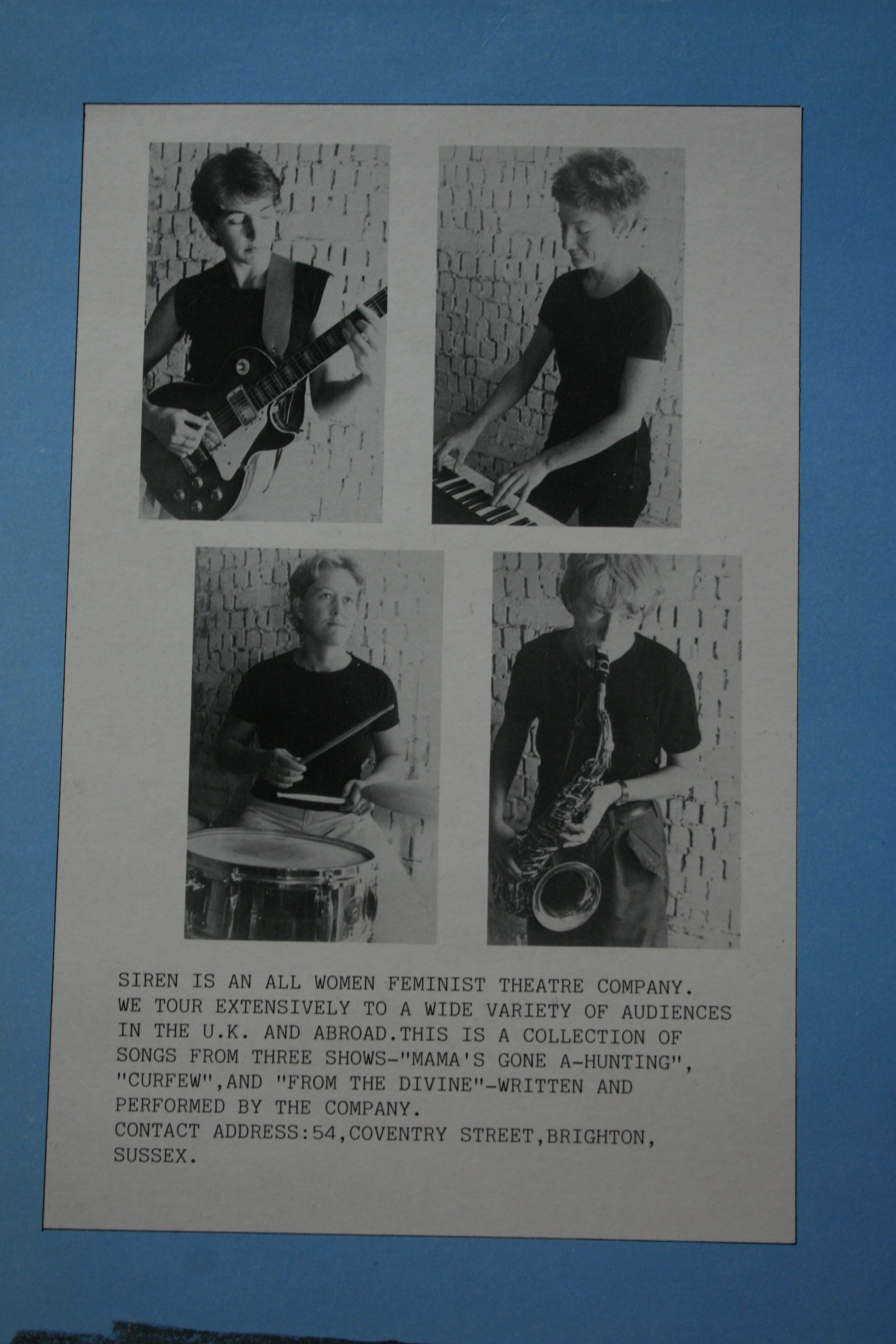 A scanned image set of the Siren Theatre Company 1982 vinyl record and sleeve 'Siren Plays', released by 'Stroppy Cow records’. It shows a list of the inner sleeve with the lyrics of 10 songs composed by various members of Siren and performed by Siren. It also shows photographs of Siren on the back cover, namely Jane Boston guitar, Jude Winter keyboards, Debra Trethewey drums and Tasha Fairbanks saxophone.