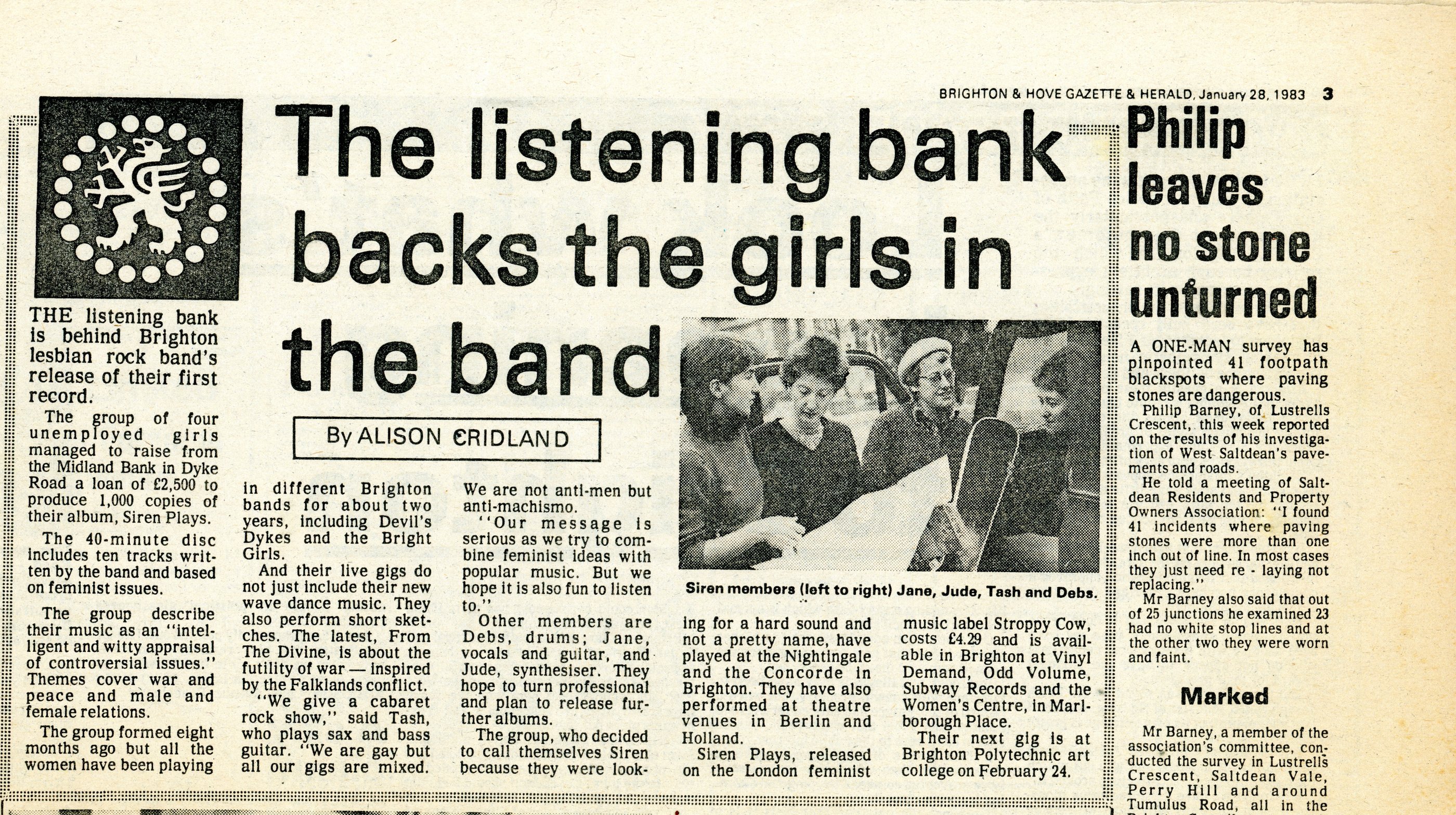 The article inaccurately says Siren formed “eight months ago”, which would have been in 1982, but Siren actually started in 1979 and produced their first play (with music) in 1980. The article referred to the Midland Bank in Dyke Road as being ‘behind Brighton’s lesbian rock band’. The bank was actually not aware that it was lending money to a lesbian band, which in 1983 was not a trendy thing to do!