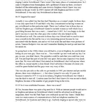 - Interview with Jenny Bennett for Queer in Brighton Oral History Project (2012-2014): snippet