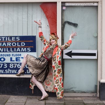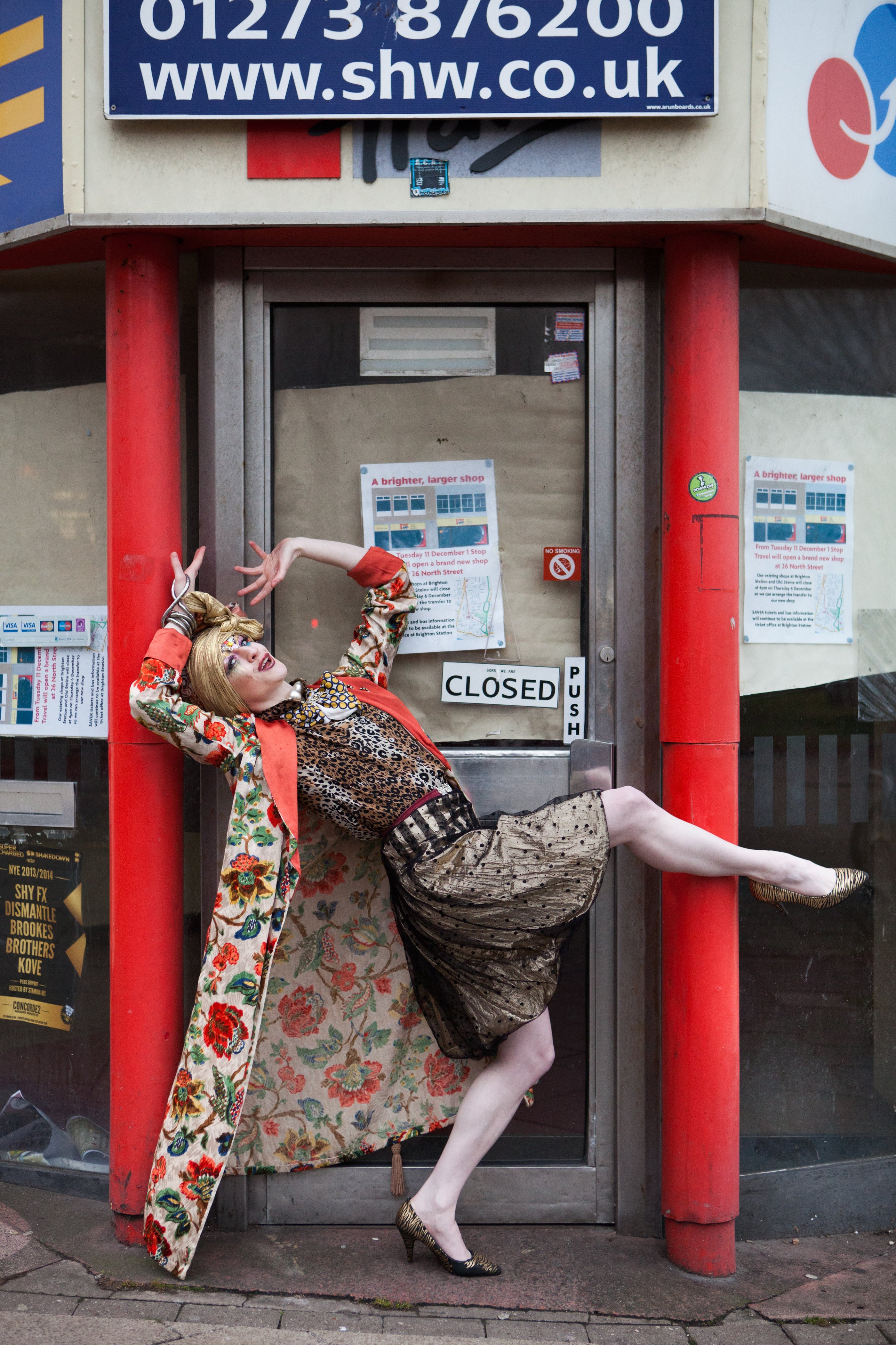 Promotional photoshoot for dance theatre performance 'New Ways of Living' choreographed by Gary Clarke. The photos feature performer Eleanor Perry with makeup inspired by The Bloolips. The photoshoot took place on St James St int he Morrisons lift and carpark, outside the former One Stop Travel Shop and in the electrical retailer Deans.