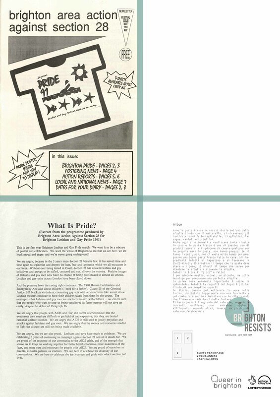 Brighton Resists uses the Section 28 campaign as a starting point to look at the history of LGBTQ+ activism in our city. Using collections at The Keep (University of Sussex) and from the Queer in Brighton archive, as well as pictures from Melita Dennett's personal collection, this exhibition gives snapshots of when our communities have come together to resist oppressive legislation, harassment and invisibility.