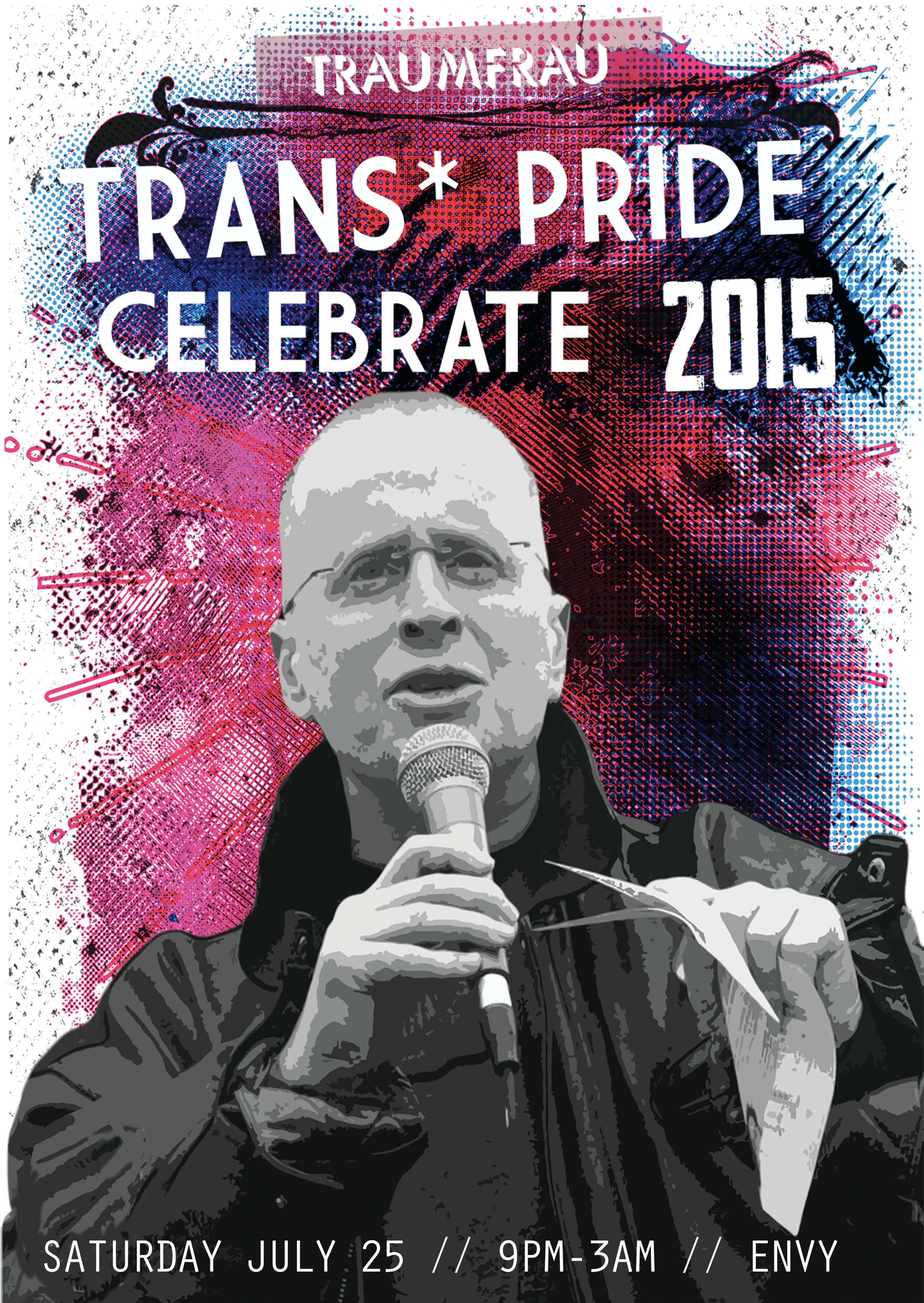 The digital poster for Traumfrau queer party event organised for Trans Pride Brighton in 2015. With DJs Alex Spinks, Kate St Kate Shields, and Dolly Dollycore. Live performances by Miss Cairo, Krishna Istha, and Eli Harris. The event took place at Envy Nightclub on the 25th of July 2015.