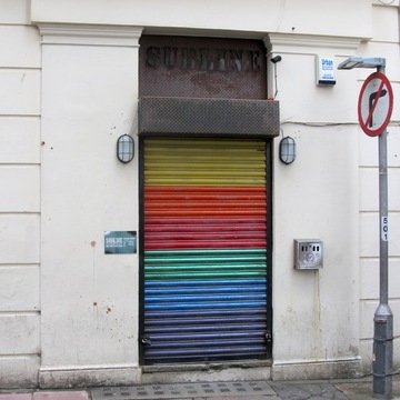 2. This photo shows a doorway shutter which is painted with rainbow stripes.