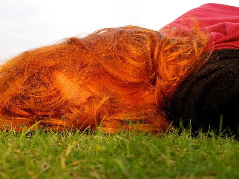 1. This image depicts Sarah lying down in the grass with her hair covering her face.