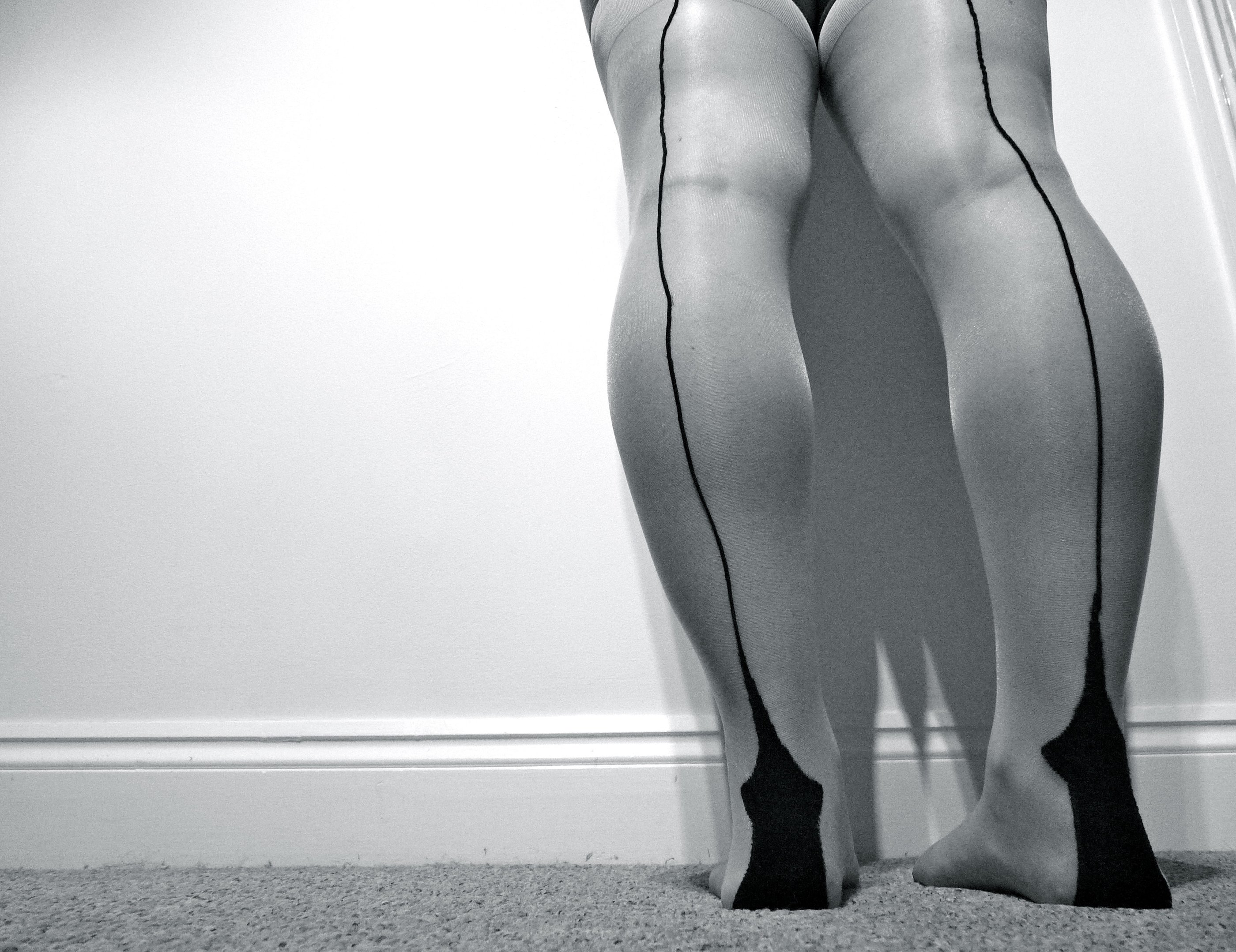 2. This photograph depicts someone facing a wall and captures their legs dressed in stockings.