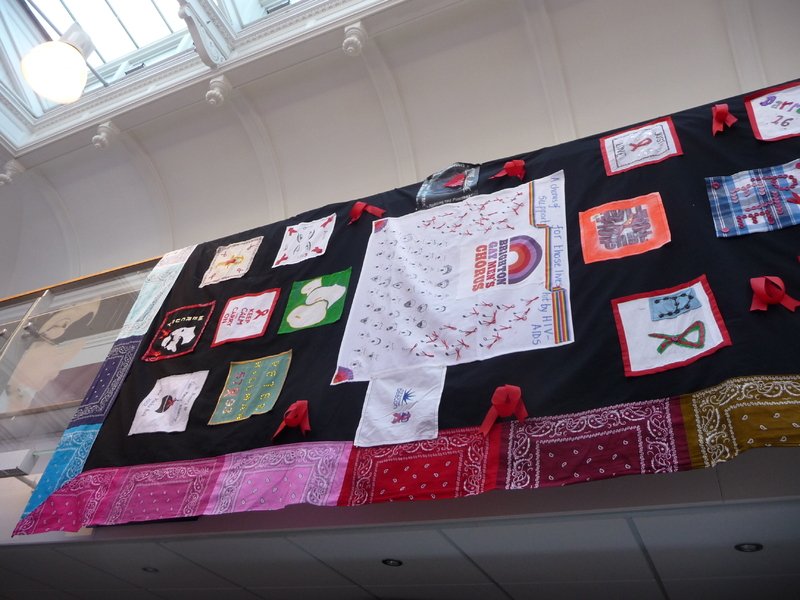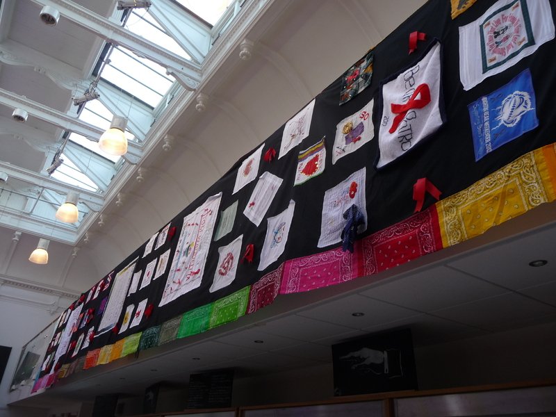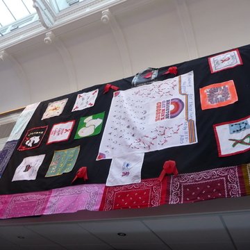 In 2012, Peter Moxom and Maurice McHale Parry revised the idea of the Name Project and reinvented it as the Hankie Quilt Project. Moxom and McHale put a call out for people to sew a name on to a hankie which was then sewn on to a larger panel by Robin Thompson. The project became part of that year’s Brighton & Hove Pride march and was displayed at the Brighton Dome and the Jubilee Library. Andrea Philippe Regard’s hankie is the green one with a representation of white arum lilies.