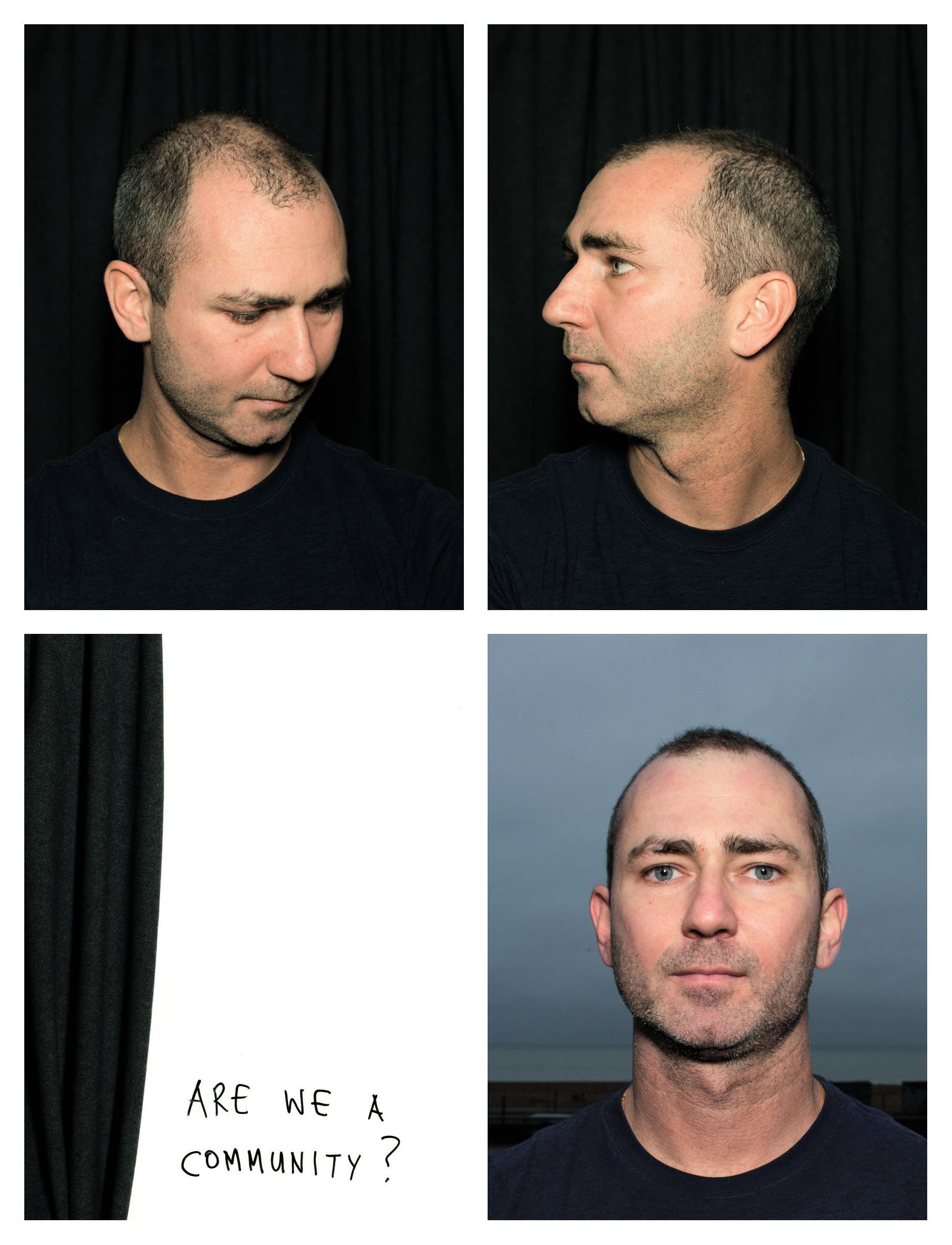 This portrait was created as part of Not Going Shopping in collaboration with Anthony and the 11 participants. It is composed of two self portraits taken in a photobooth, a written note by the subject of the portrait, and a portrait taken at Brighton Seafront (bottom right). Anthony's written note reads "ARE WE A COMMUNITY?"
