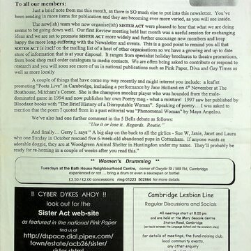 Social and peer support group, Sister Act, produced a monthly newsletter in the 1990s and early 2000s for and by lesbians in Cambridge and East Anglia, and this is a scan of one edition. It was a lifeline for a circulation list of 150-200 women of all ages, helping to create a genuine community for closeted gay women and out-and-proud dykes alike, at a time when their lives and concerns were much debated in parliament and the media. I was editor for a while, and lived from one women's disco to the next, meeting partners and friends who would remain in my life for decades. Nowadays I'm experiencing deja vu having to navigate the pros and cons of coming out all over again and finding a new community as a trans man, now living near Brighton.