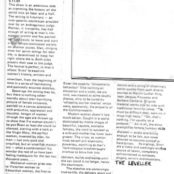 The review was written after a performance at Hoxton Hall, London. The writer has endless praise for Siren, concluding that "the show exemplifies female humour as its sharpest - acidic and biting enough to be felt, but never allowed to become cynical or had-bitten. As a group, Siren are a lively and seemingly endless source of talent, completely self-contained as actresses, singers, writers and musicians."