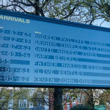 Arrivals + Departures Wednesday 5 May 2021 Artists Yara and Davina create ambitious public artworks that respond to site, context and audience. Their inventive, issue-based work is wide ranging, and uses a lightness of touch that make their works both poetic and universal. Arrivals + Departures invites the public to share the names of those who have arrived and departed on live boards, to acknowledge, celebrate and commemorate. On Wednesday 5 May 2021 Yara and Davina invited me to ‘takeover’ the boards of their Brighton International Festival exhibit in Pavilion Gardens to commemorate the lives of those who died from an AIDS-related illness in Brighton & Hove. It was an honour & a pleasure to be invited to be a part of this wonderful public artwork exploring birth, death, and the journey in between. ‘In the roaring waters, I hear the voices of dead friends Love is life that lasts forever My hearts memory turns to you...’ Andrea Philippe Regard Arrival - 16 March 1965 / Departure - 13 May 1991 Graham Charles Wilkinson Arrival - 08 December 1949 / Died 22 August 1990 (London Lighthouse) David Andrew Jones ‘Cooch’ Arrival - 17 July 1962 / Departure - 18 October 1999 Gary Beverly Arrival - 26 September 1956 / Departure - 23 June 1993 Father Marcus Riggs Arrival -1955 / Departure - 10 July 1998 Clive Bentley Arrival - 07 August 1961 / Departure - 17 August 1994 Kevin John Dodd Arrival - 21 May 1962 / Departure - February 1992 The quoted text comes from the film ‘Blue’ by Derek Jarman.