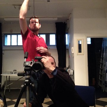 7. This image portrays Edward Whelan and Anthony Luvera behind the camera, with Luvera adjusting the lighting.