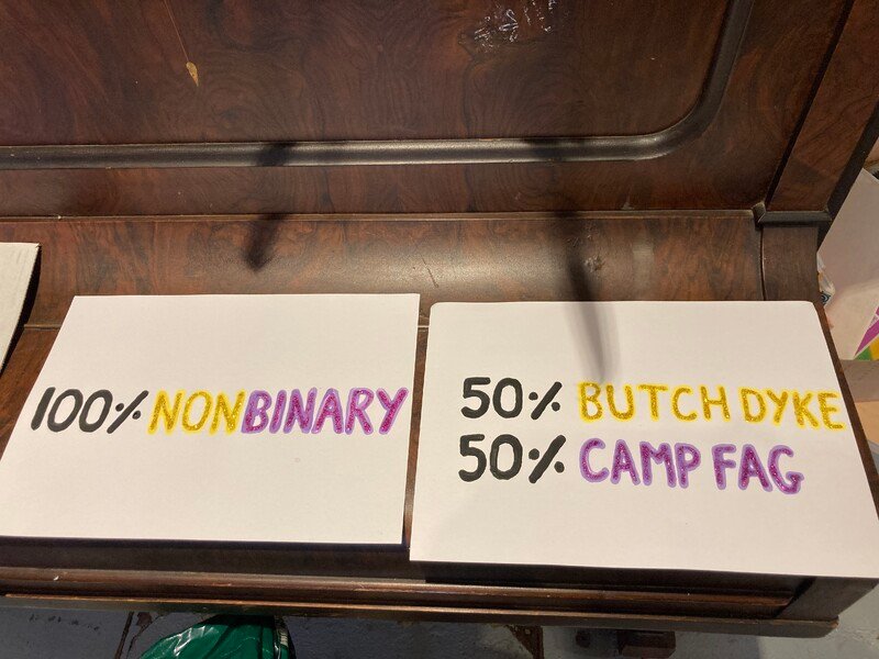 Trans Pride Brighton Sign "50% BUTCH DYKE, 50% CAMP FAG, 100% NONBINARY"