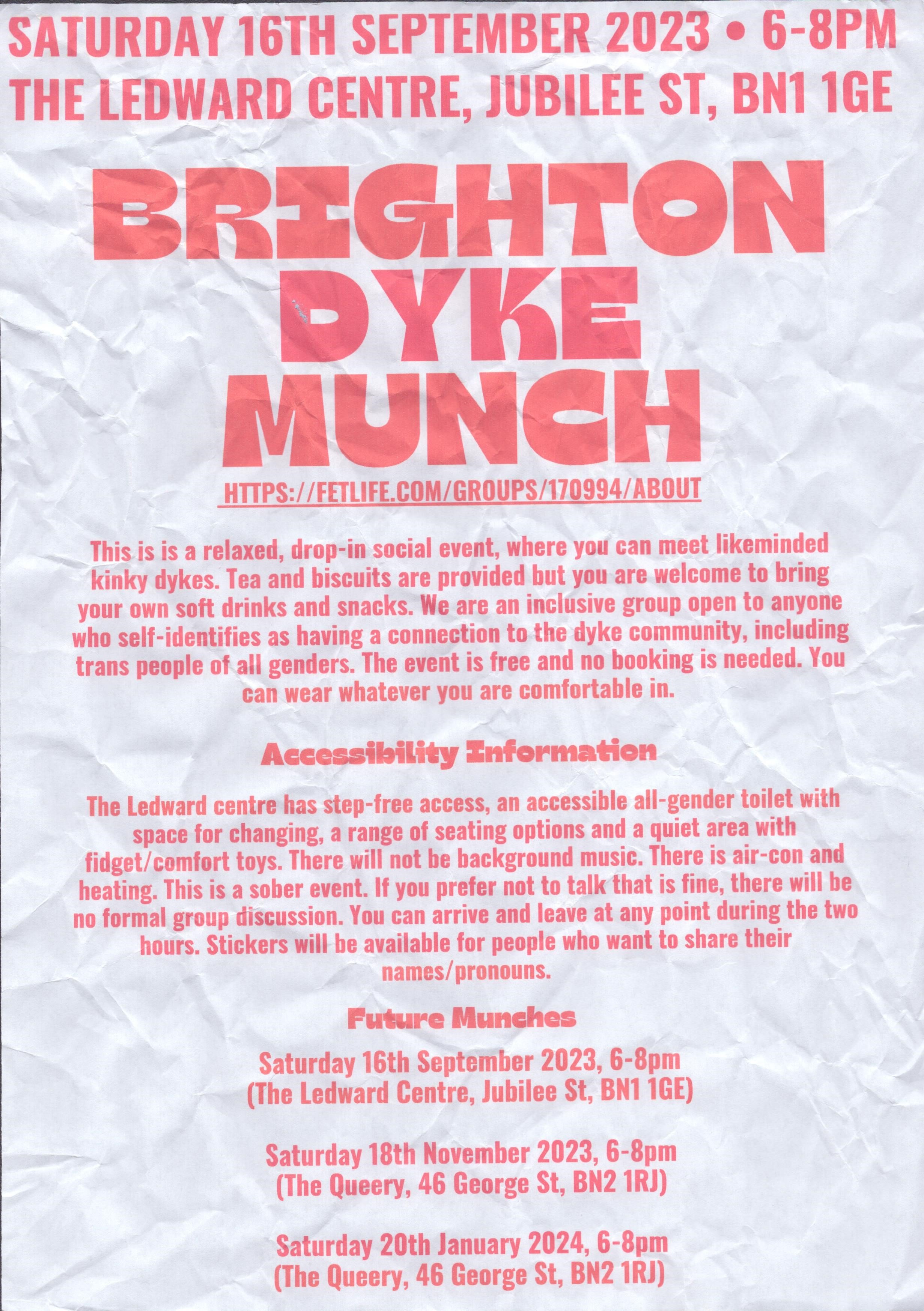 A poster for the first Brighton Dyke Munch, made by me. The poster was displayed at The Ledward Centre in August-September 2023. The munch took place on 16th September 2023. The event was attended by around 40 kinky dykes of all genders, who gathered together to chat over tea and biscuits.