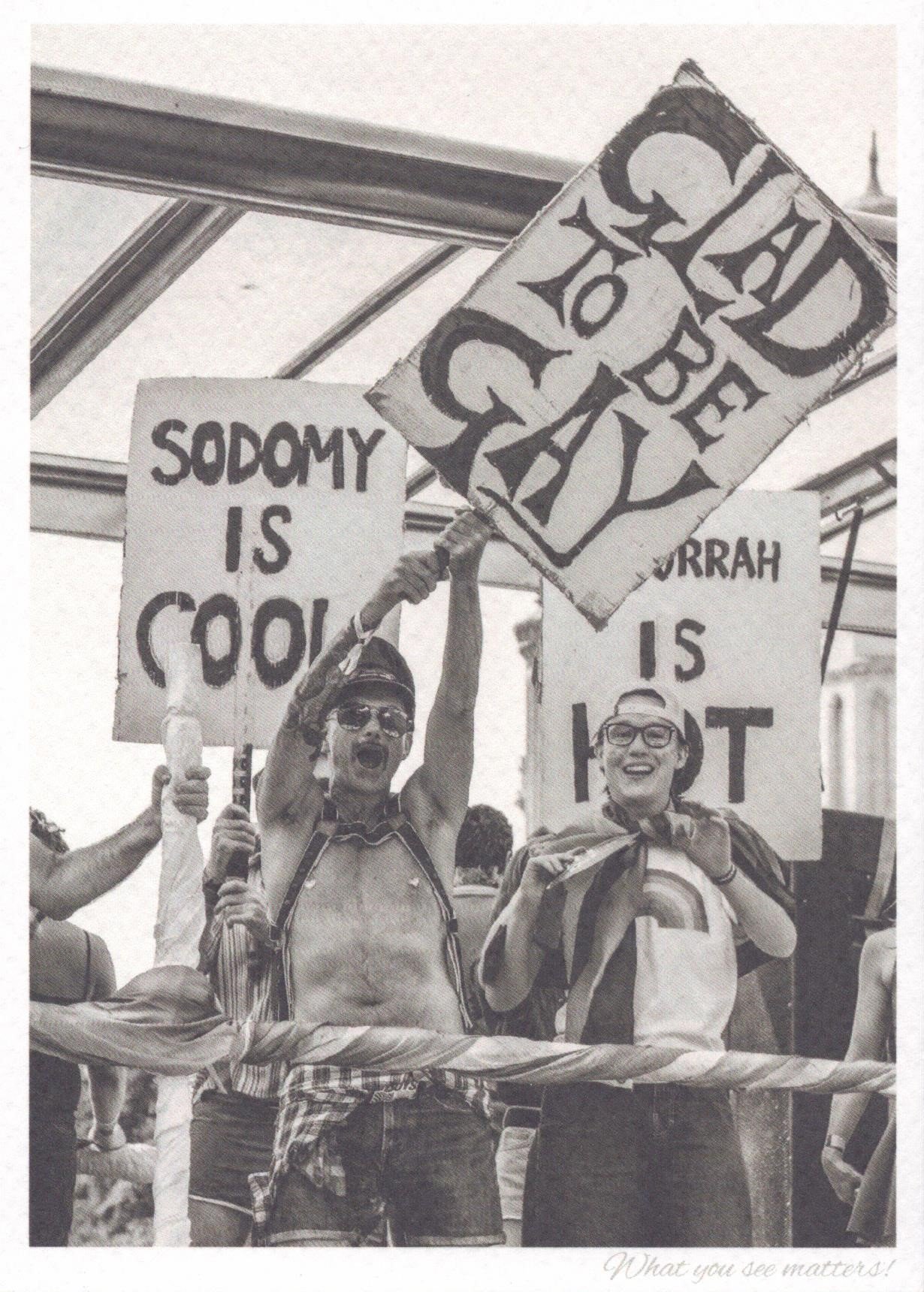 Pride float 2023. To commemorate the 50 years since the very first Brighton Pride, Alf Le Flohic and I recreated some placards we had seen the Sussex GLF carrying on some of their protest marches. Gomorrah is Hot was a bit of poetic licence to go with the one about Sodomy being cool, which is a slogan seen in one of the old photos. Also on the float was my friend Danny and several fellow community curators from the Queer the Pier Exhibition at Brighton Museum.