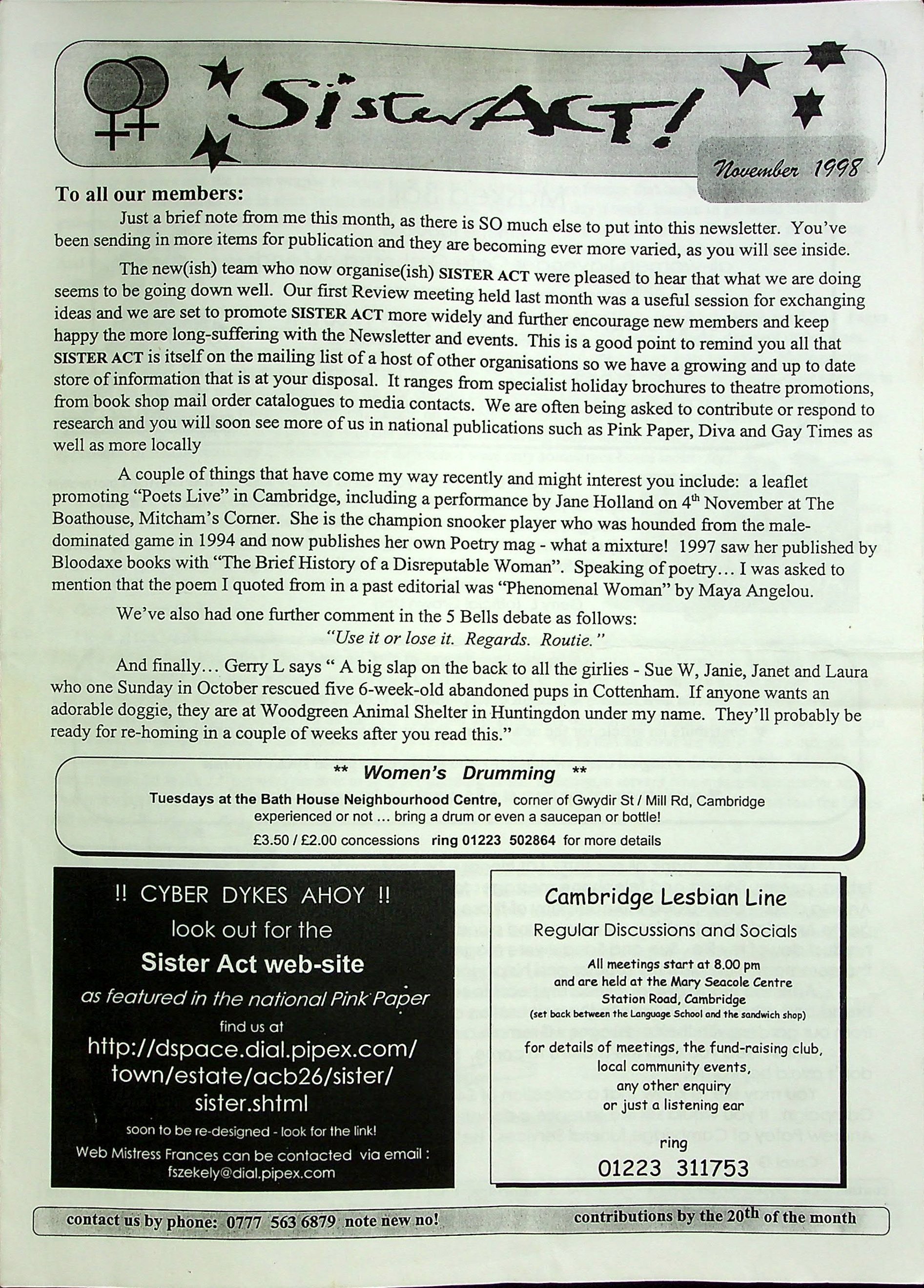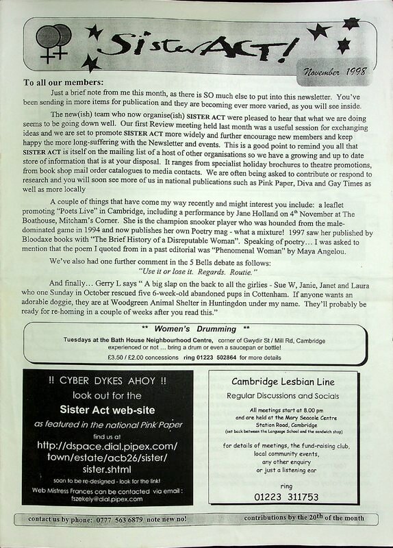 Social and peer support group, Sister Act, produced a monthly newsletter in the 1990s and early 2000s for and by lesbians in Cambridge and East Anglia, and this is a scan of one edition. It was a lifeline for a circulation list of 150-200 women of all ages, helping to create a genuine community for closeted gay women and out-and-proud dykes alike, at a time when their lives and concerns were much debated in parliament and the media. I was editor for a while, and lived from one women's disco to the next, meeting partners and friends who would remain in my life for decades. Nowadays I'm experiencing deja vu having to navigate the pros and cons of coming out all over again and finding a new community as a trans man, now living near Brighton.