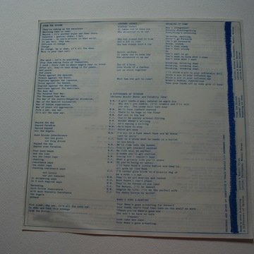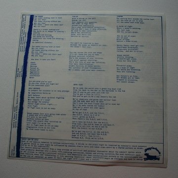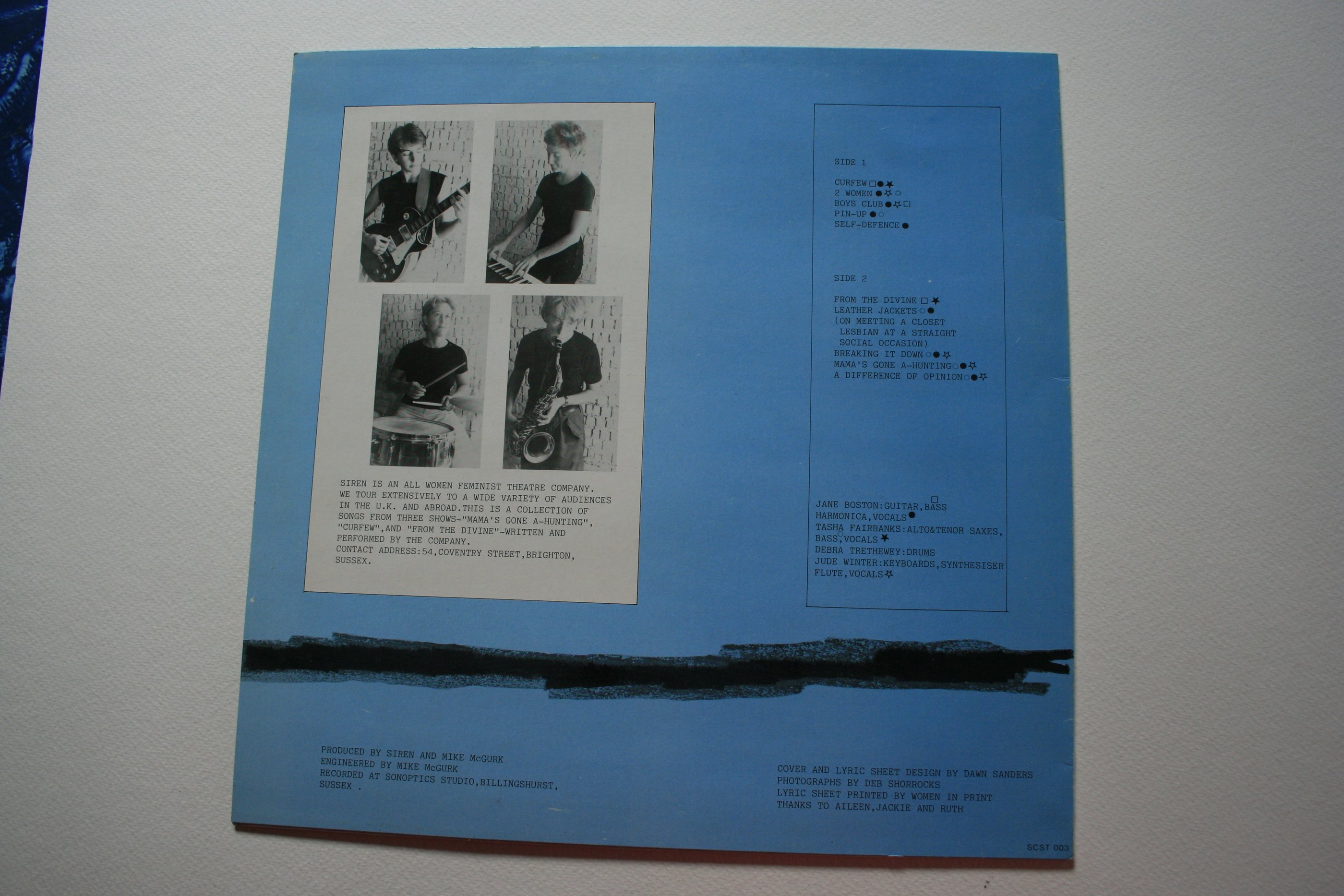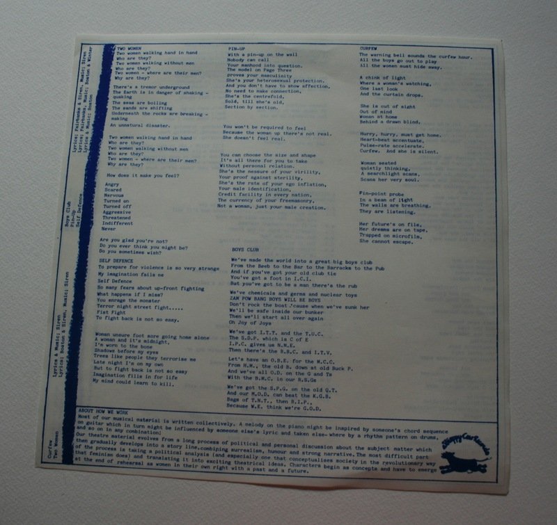 A scanned image set of the Siren Theatre Company 1982 vinyl record and sleeve 'Siren Plays', released by 'Stroppy Cow records’. It shows a list of the inner sleeve with the lyrics of 10 songs composed by various members of Siren and performed by Siren. It also shows photographs of Siren on the back cover, namely Jane Boston guitar, Jude Winter keyboards, Debra Trethewey drums and Tasha Fairbanks saxophone.