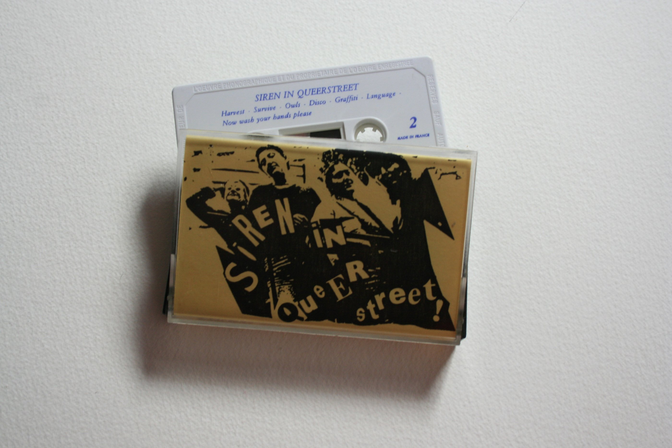 This image set depicts the cover, front and back, and cassette tape of Siren’s music release ‘Siren in Queerstreet’. It shows a list of the 13 tracks on the cassette, which included songs from some of the plays as well as songs composed by various members of Siren, and performed by Siren band. The tape was recorded at Newhaven Boys’ Club and at Real Time Studio Billingshurst. Cover photo by Susy Taylor.