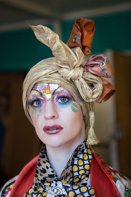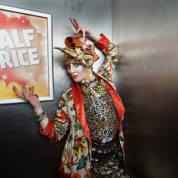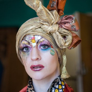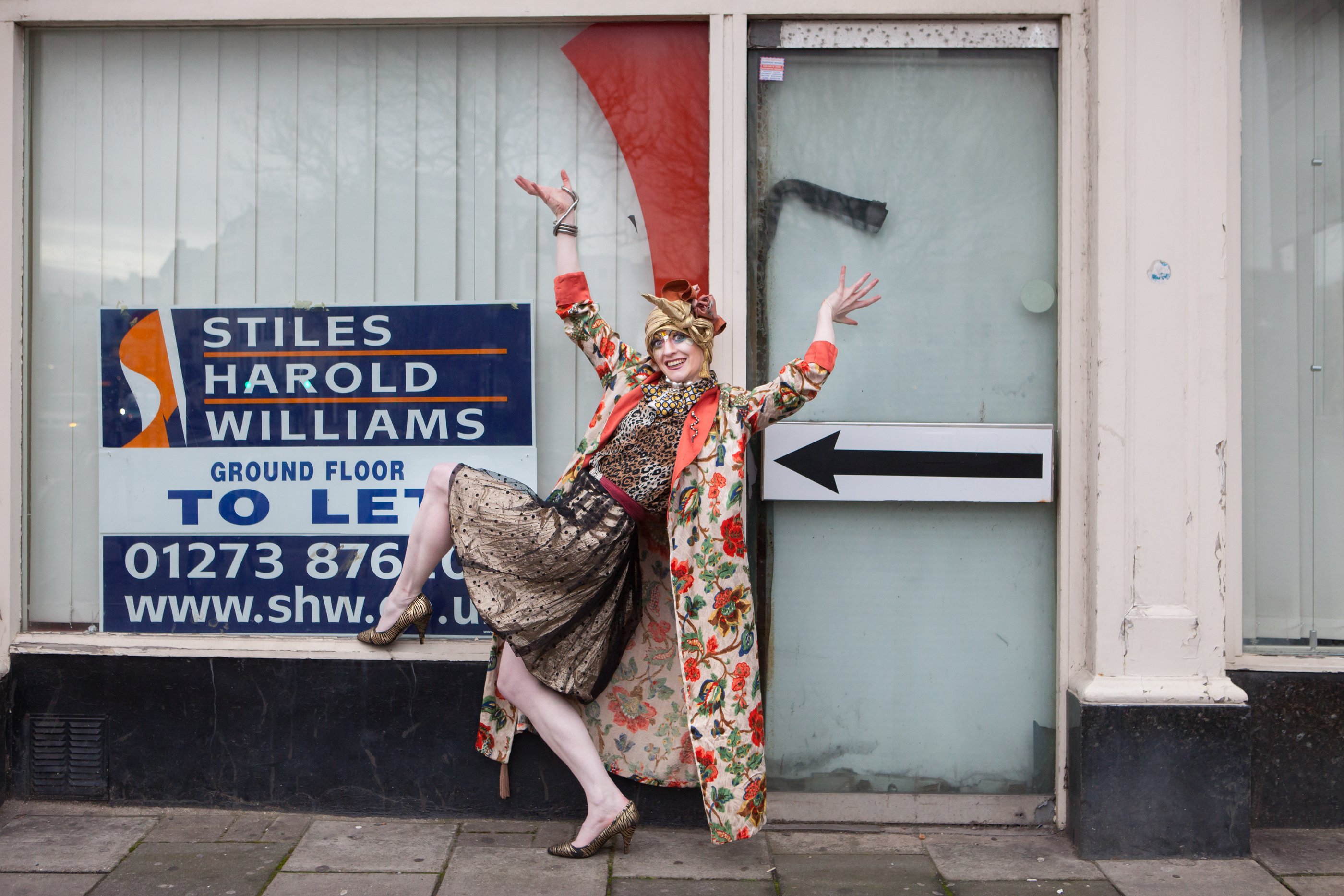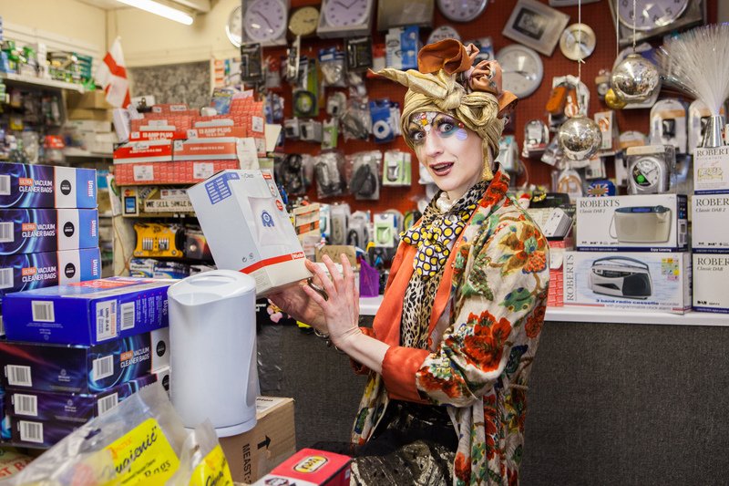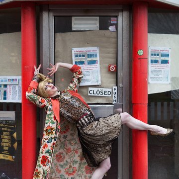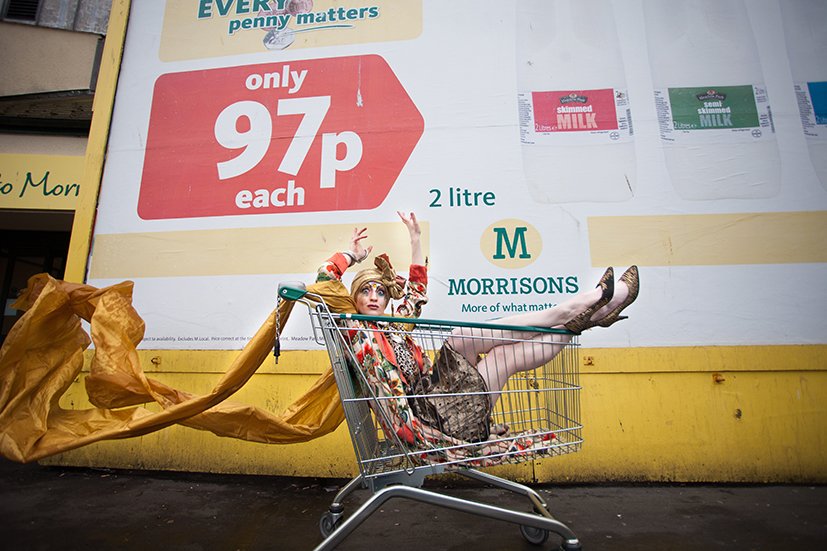 Promotional photoshoot for dance theatre performance 'New Ways of Living' choreographed by Gary Clarke. The photos feature performer Eleanor Perry with makeup inspired by The Bloolips. The photoshoot took place on St James St int he Morrisons lift and carpark, outside the former One Stop Travel Shop and in the electrical retailer Deans.