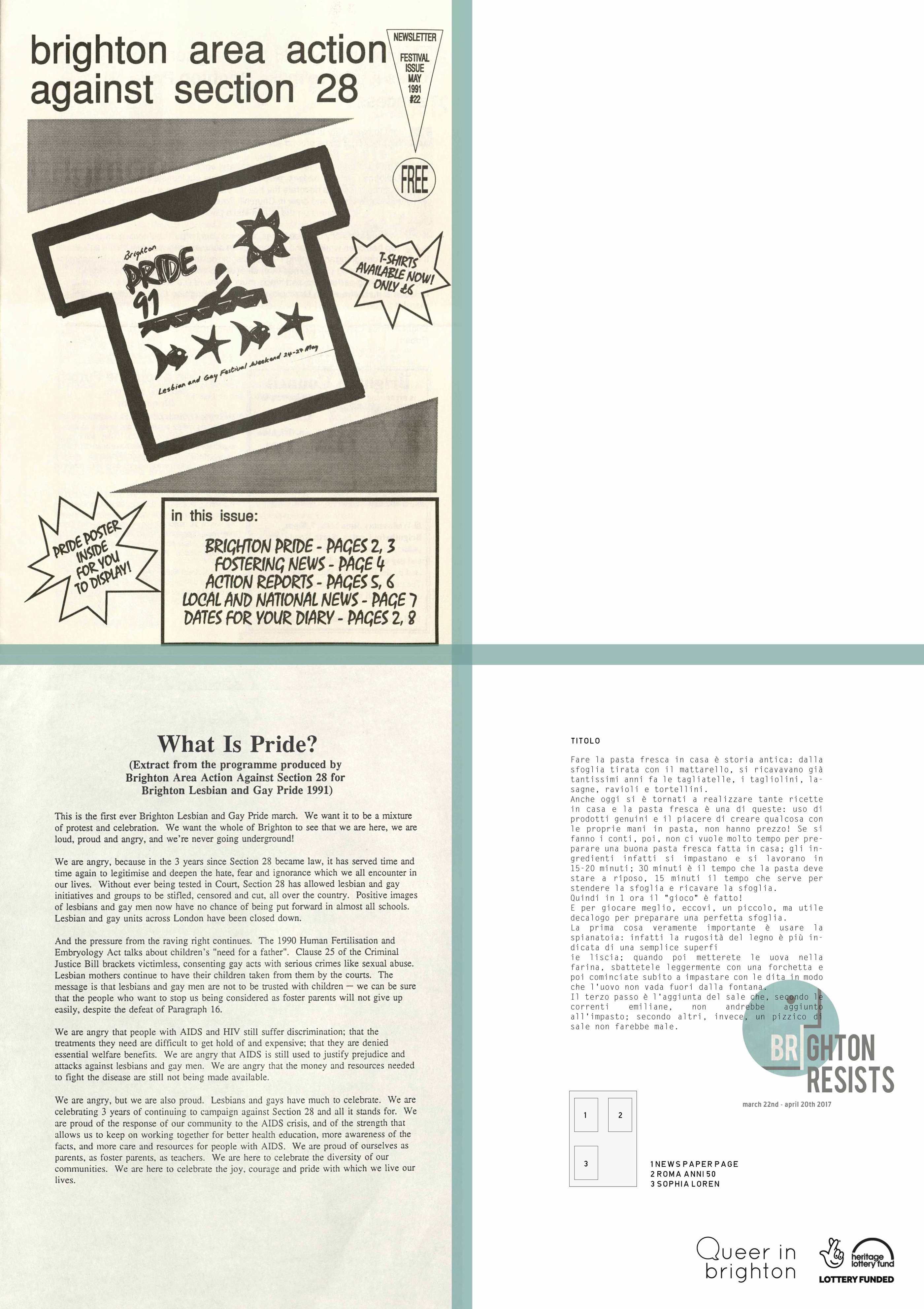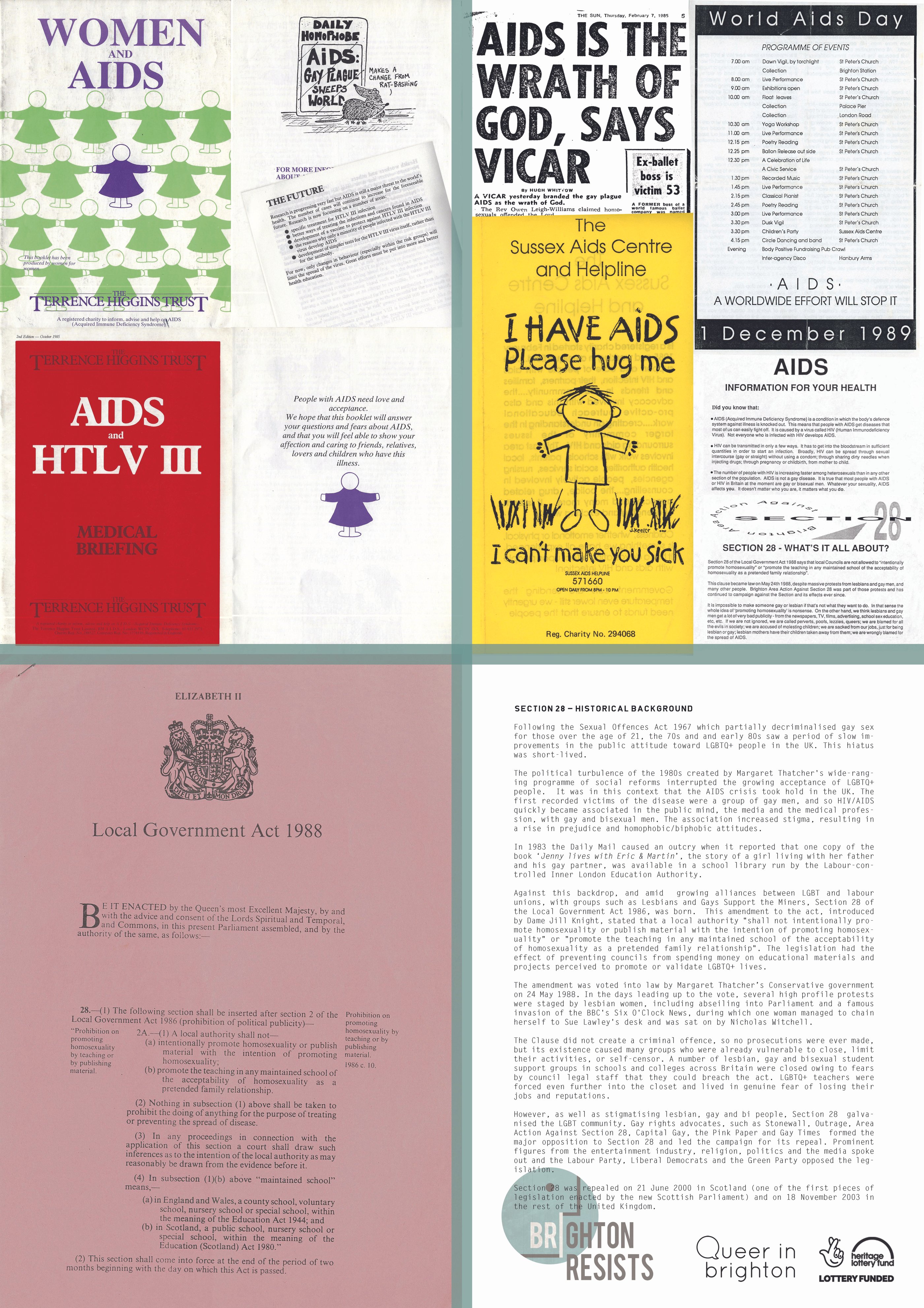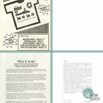 Brighton Resists uses the Section 28 campaign as a starting point to look at the history of LGBTQ+ activism in our city. Using collections at The Keep (University of Sussex) and from the Queer in Brighton archive, as well as pictures from Melita Dennett's personal collection, this exhibition gives snapshots of when our communities have come together to resist oppressive legislation, harassment and invisibility.
