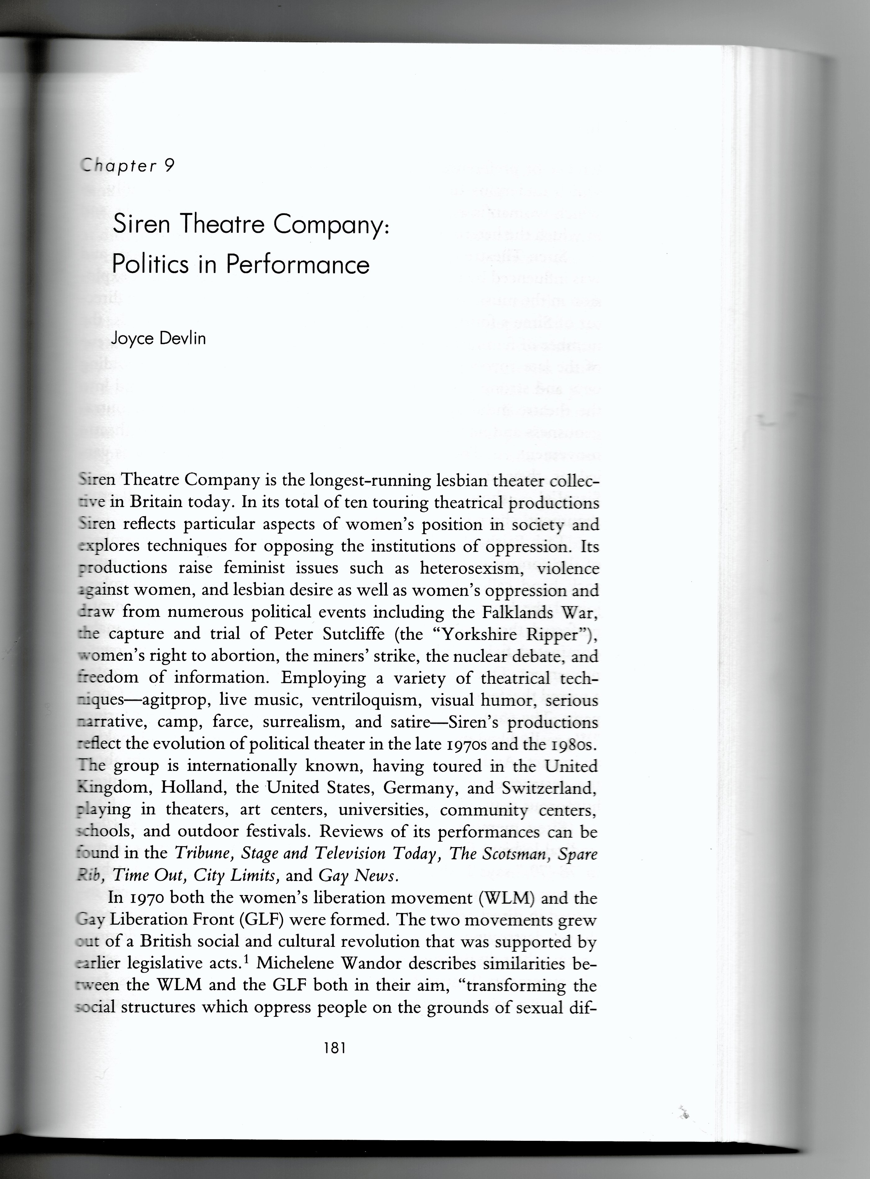 2. The chapter was entitled Siren Theatre Company: Politics in Performance. It referred to Siren as having been the longest-running lesbian theatre collective in Britain at the time.