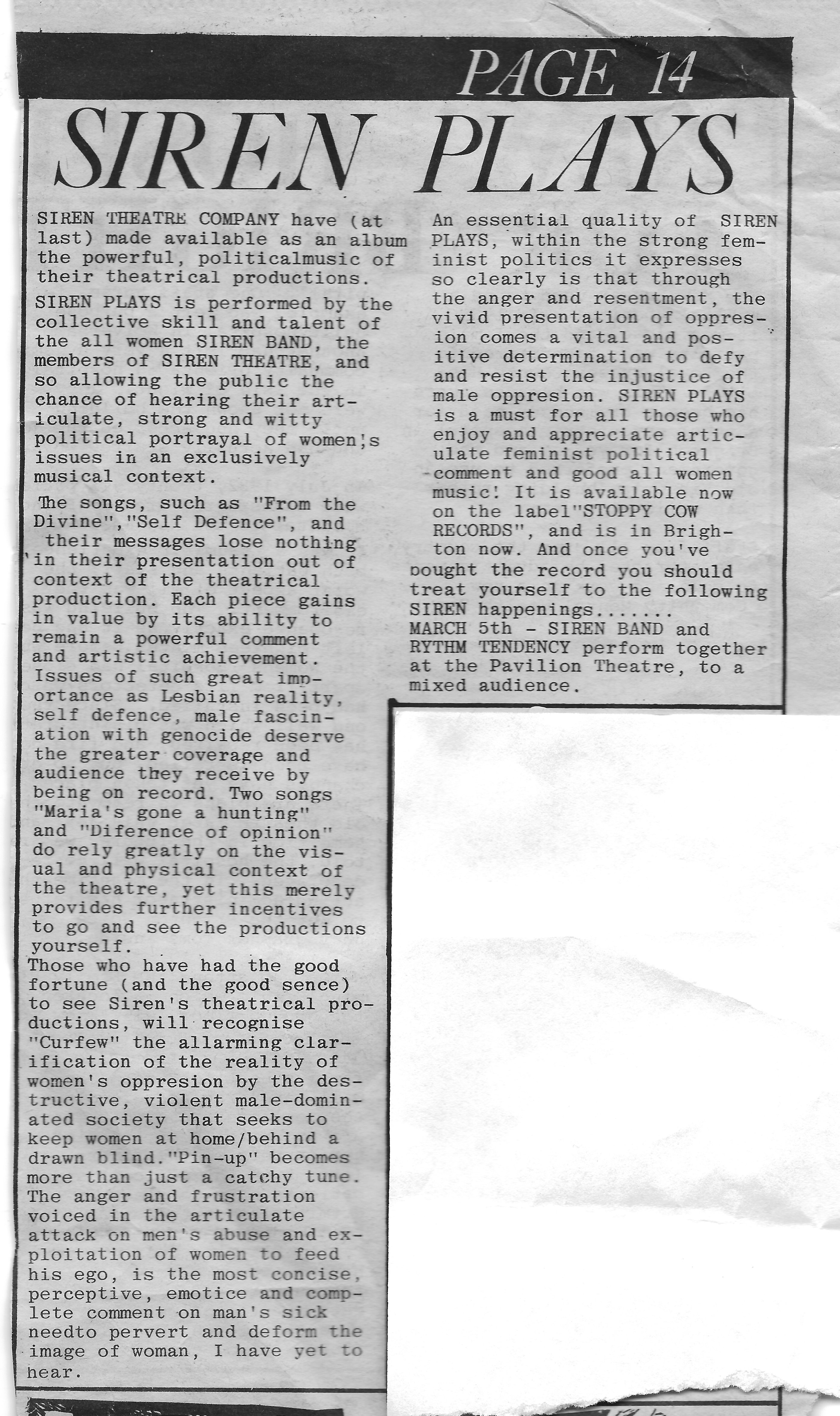 The review is positive about Siren’s first album “Siren Plays’, praising their "articulate, strong and witty political portrayal of women's issues in an exclusively musical context."