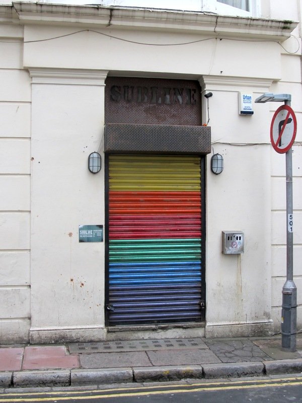 2. This photo shows a doorway shutter which is painted with rainbow stripes.