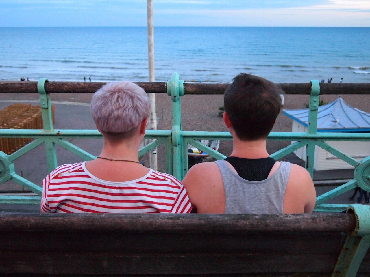 2. This photograph depicts two people sat on a bench at the seafront staring at the sea, taken from behind the subject.