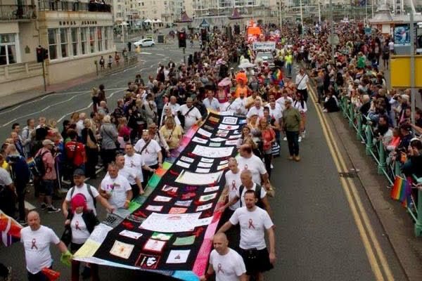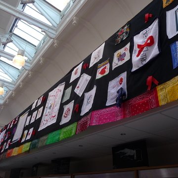 In 2012, Peter Moxom and Maurice McHale Parry revised the idea of the Name Project and reinvented it as the Hankie Quilt Project. Moxom and McHale put a call out for people to sew a name on to a hankie which was then sewn on to a larger panel by Robin Thompson. The project became part of that year’s Brighton & Hove Pride march and was displayed at the Brighton Dome and the Jubilee Library. Andrea Philippe Regard’s hankie is the green one with a representation of white arum lilies.