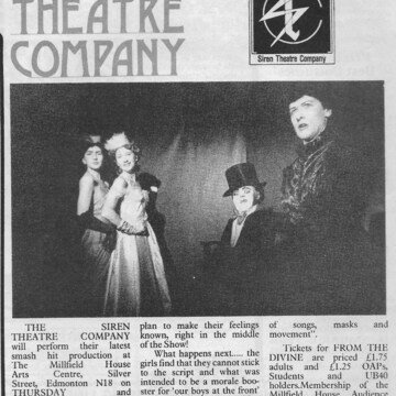 Digital reproduction of the cover of City Limits magazine, with a review of Siren's play ‘From the Divine', which was performed at Hoxton Hall and Jackson’s Lane theatres, London.