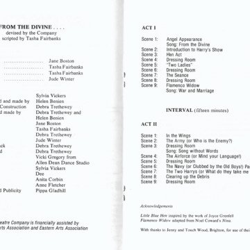 Digital Reproduction of the centre pages and back page of the programme for the Siren Play 'From the Divine'.