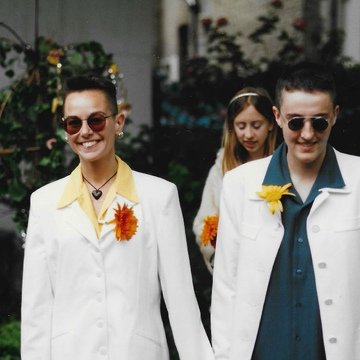 Having met in 1993 it took a while for the law to catch up with our love. We made the best of it - DIY wedding in 1997, Civil Partnership in 2008 but it wasn't until 2015 that we finally made it to equal marriage. But as all good queers should do, we made the most of the journey to equality. Celebrating with our chosen family, dancing and laughing - wedding hats not always optional.