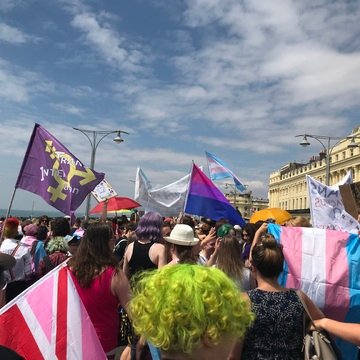 My first time feeling confident enough (and having friends who wanted to go!) for the Trans Pride afterparty at Concorde 2. After quite a few drinks and realising I had a crush on my friend (now my partner) the three of us got these instant photos from the photobooth and laughed as we realised how unflattering they were. It was also the night the Royal Albion Hotel burnt down - the air was full of smoke and the energy was a bit manic. It was nice to celebrate trans joy amid turbulent times for our community.